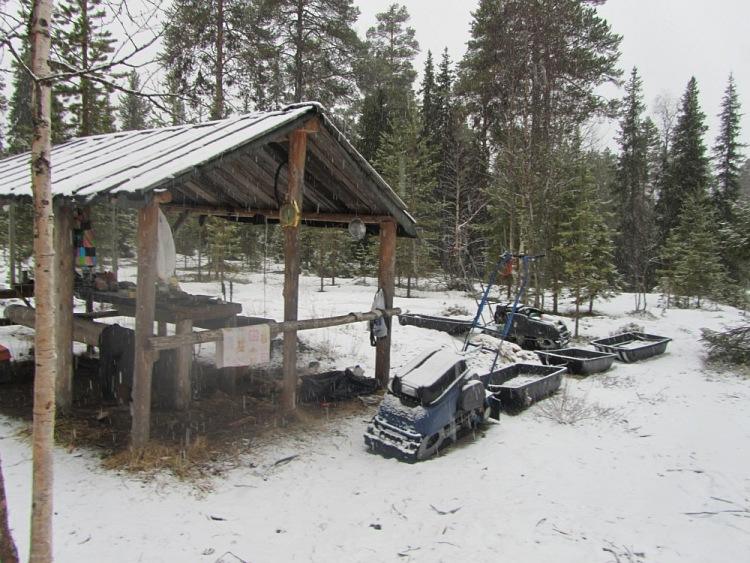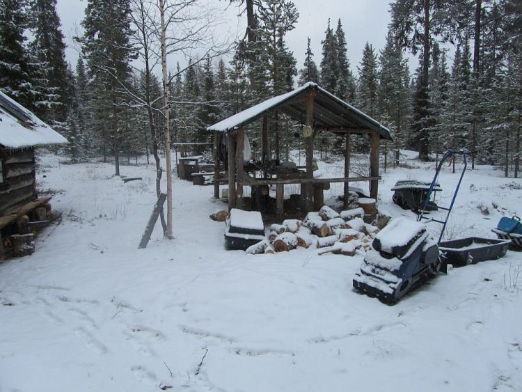 Утро третьего дня нас встретило снегом. Тропинки, оттаявшие куртинки, волокуши, «Следопыты», ели, березки, мостик через ручей покрыты белый легким снежком. Разве, что под навесом пожухлая прошлогодняя трава.
