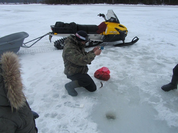 В дальнем конце Золотого ребята приехали на снежнике. Семен побежал здороваться, не дожидаясь. Когда я уж закончу живцов наверх майнать и опускать, долго ждать. Пару размоток. Один окунек слегка придавлен за голову.