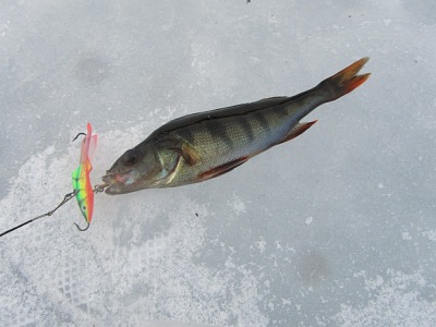 С полчаса побаловался. Три десятка полосатых на льду. Можно и к избе возвращаться.