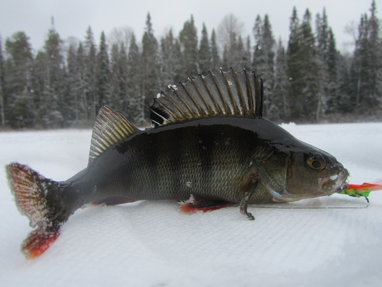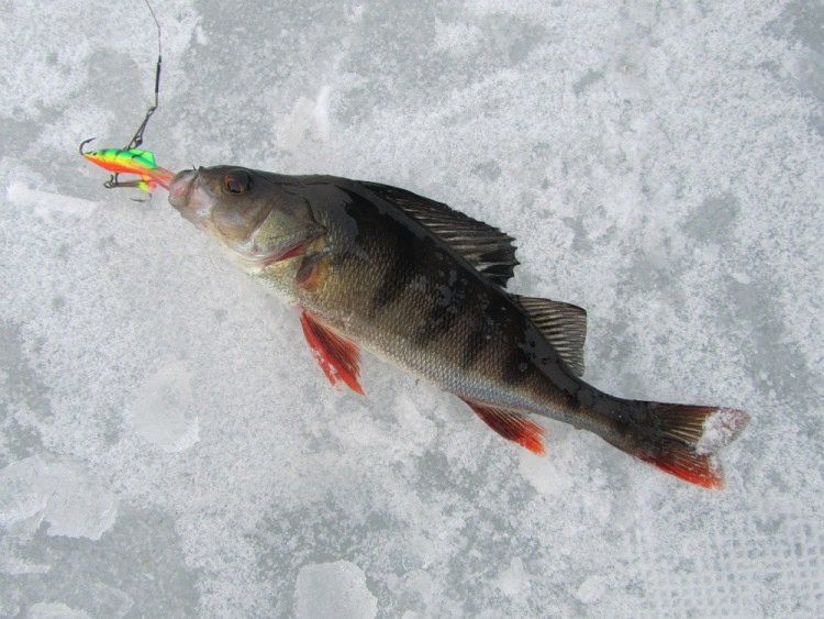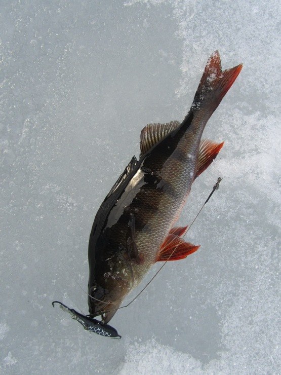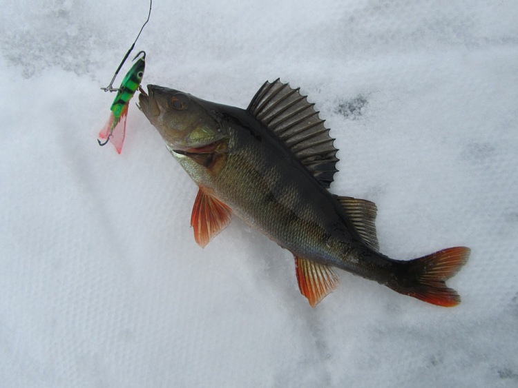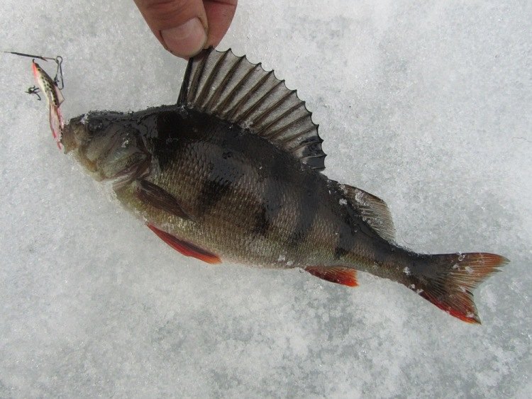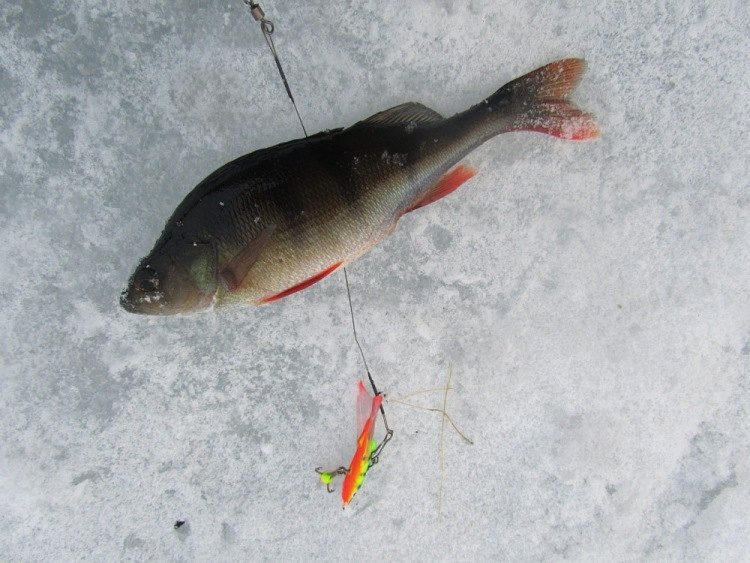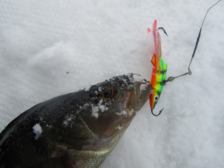 На одной лунке перестанет ловиться, на другую перехожу. Рыба везде клюёт. При том, если вначале и потычку выдаст, то при опускании вновь подходит и атакует. Остается разыграть балансир, раздразнить окуня. И он на льду уж трепещется