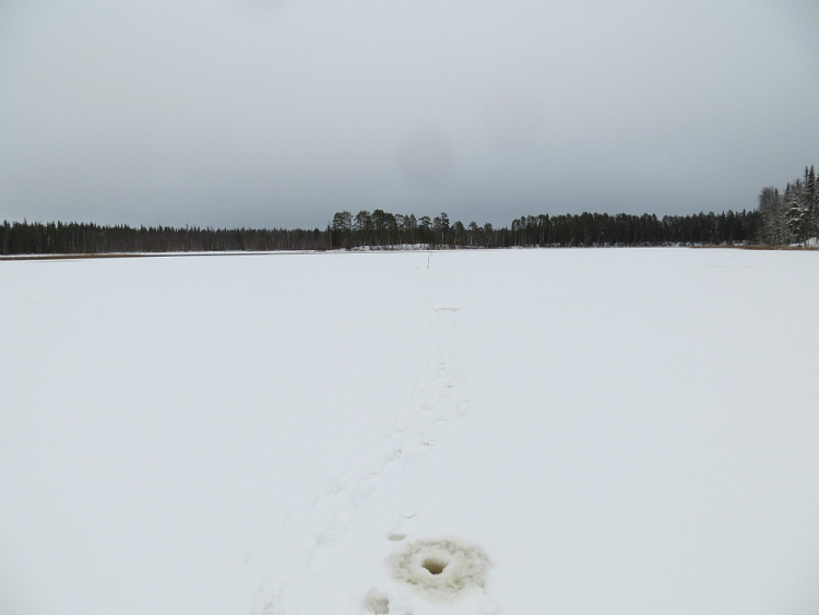 Опаньки! Поклёвки закончились. Ряд лунок вдоль берега. Тридцать шагов лунка. Лёд интересный три-пять сантиметров сверху, дальше шуга и вновь ледок, правд до того тонкий, что его толщину не определить. Получается, стоишь на тонком ледке, под ним подушка, поддерживающая из шуги, и вода. Странно, даже тонкий лед не трещит. Лишь местами из лунок, когда находишься рядом, начинает выступать вода.