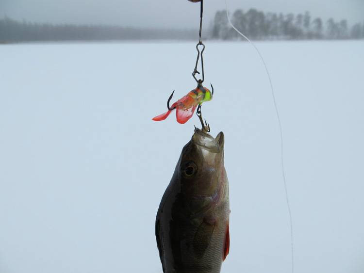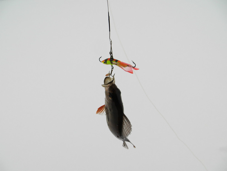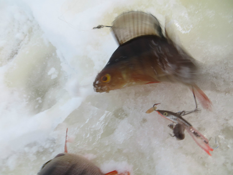 Окуньки бьют один за одним. Прихватывают глаз своего собрата вместе с тройничком