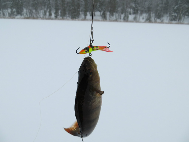 Счёт прибавляю на единицу. Вновь подброс. Замер. Приятный жесткий удар по кивку. По поклёвке предполагаю окунька покрупнее. Точно. Побольше взял. При том полностью забрал нижний тройник
