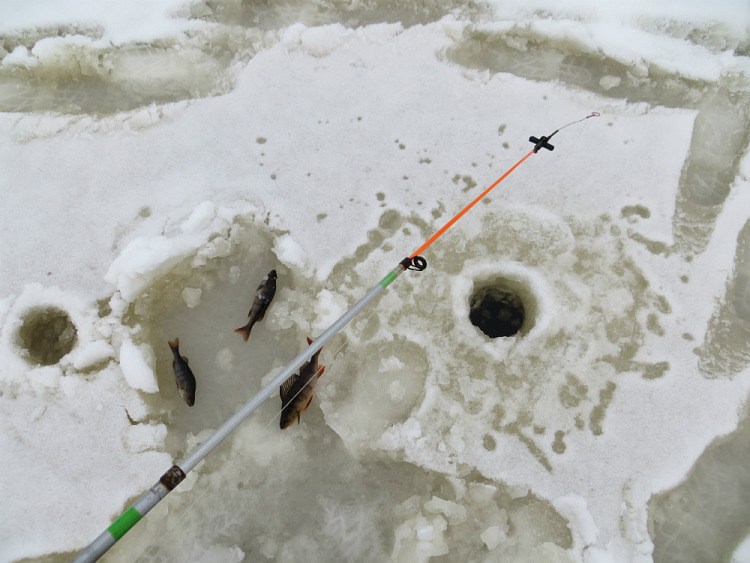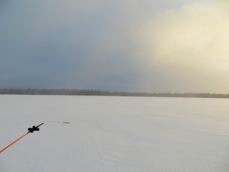 Иногда страшновато становится. Тогда поворачиваю в обратную сторону и бурю лунки параллельно имеющемуся ряду. Лунок десятка три-четыре за рыбалку насверлил. По количеству поклевок и разведанной площади клёв явно не ахти. С прошлогодним никак не сравнить.