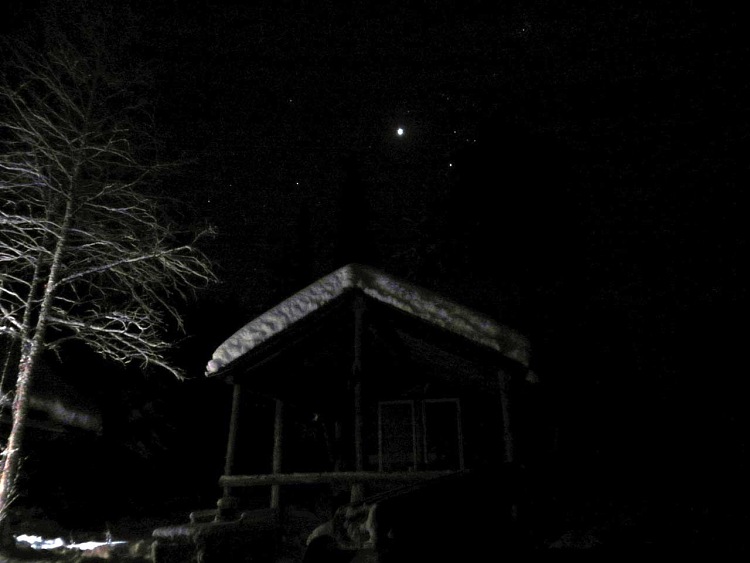 После ужина выбрался на улу. Спасибо Павлу, свет провел. Избушка чудной сказкой проступает в ночи
