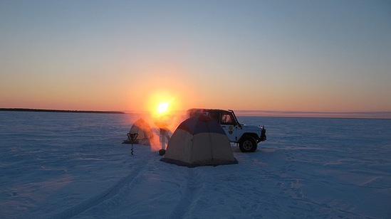 Вдалеке появился снежник, затормозил, палатку поставил. Мальчонка рядом бегает. Надо же не испугался папаня взять сына на лёд. Молодцы!