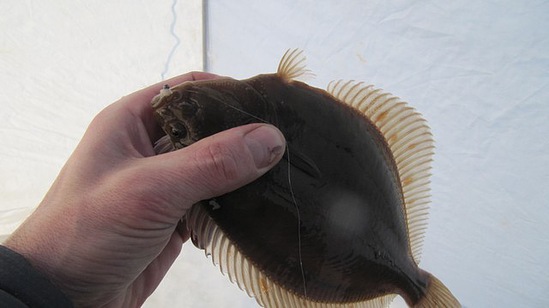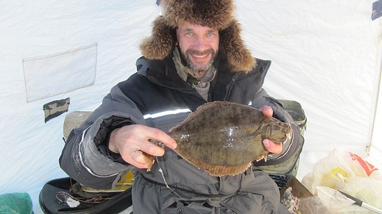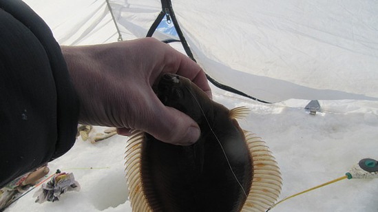 Чуть ослабил. Рыб того и ждал, резво тянет в глубину. Упругими рывками уходит дальше. «Эн, нет», - выворачиваю на себя. Веду в лунку. Понимаю. Камбала! При том не дюжего размера. Завожу в дырку, как в ворота, держу, не даю ей опять пойти погулять. То того гляди, сойдет иль леску о край льда подрежет.