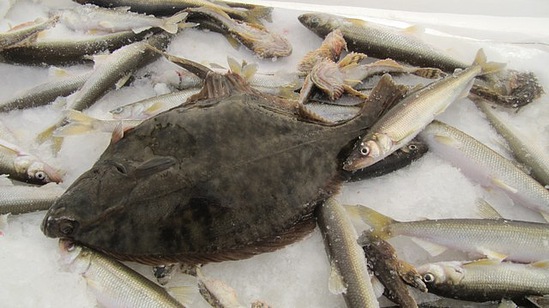Положил на лёд, камбала царственно разлеглась среди рыб
