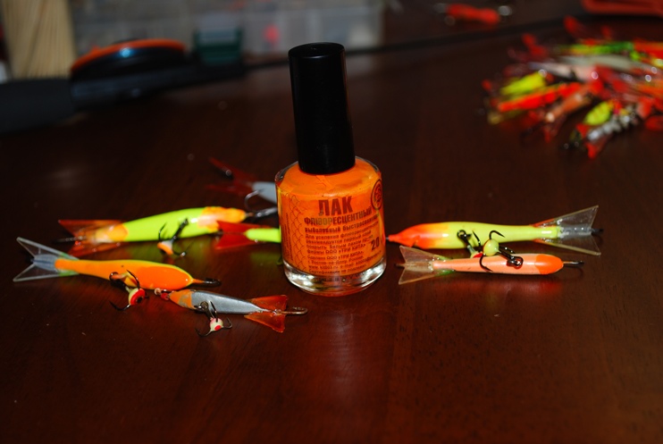 В процессе разбора снастей и перевооружения приманок помимо оснащения балансиров подвесными тройниками с яркими цветными каплями захотелось внести еще какую-нибудь изюминку. Вспомнив рекомендации рыболовов из Череповца, раскрасил несколько балансиров флюоресцентным лаком.