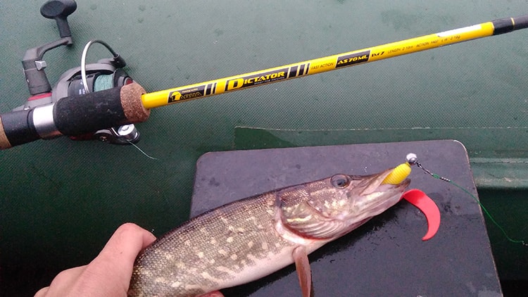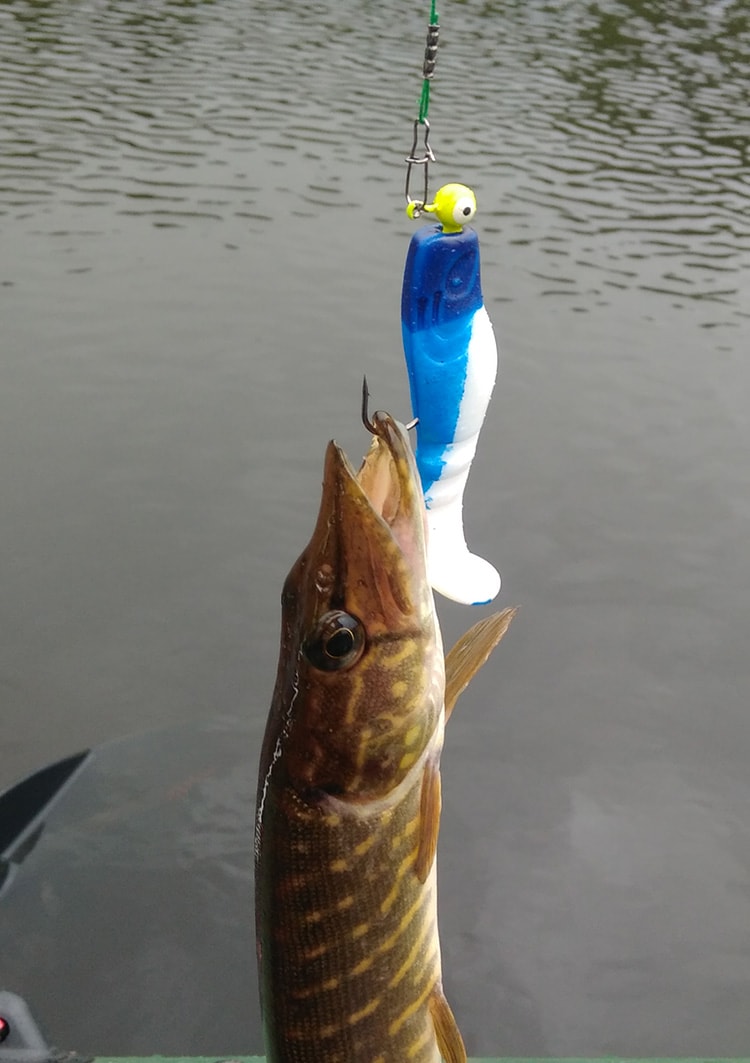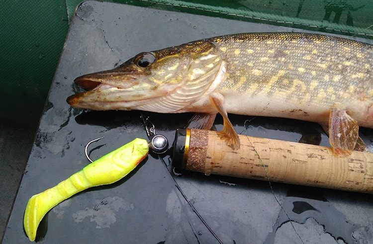 На очередном забросе напарник забросил на куст и стряхивая, у твистера оторвался хвост, пришлось заменить на другой – и почти сразу поклёвка, щурёнок чуть меньше первого, но всё равно приятный, опять помог подсачеком, но это бы не потребовалось, так как заглотил уверенно, даже пришлось подплывать к берегу чтобы взять веточку для того чтобы вытащить твистер из пасти, зубы всё-таки у щуки острые!