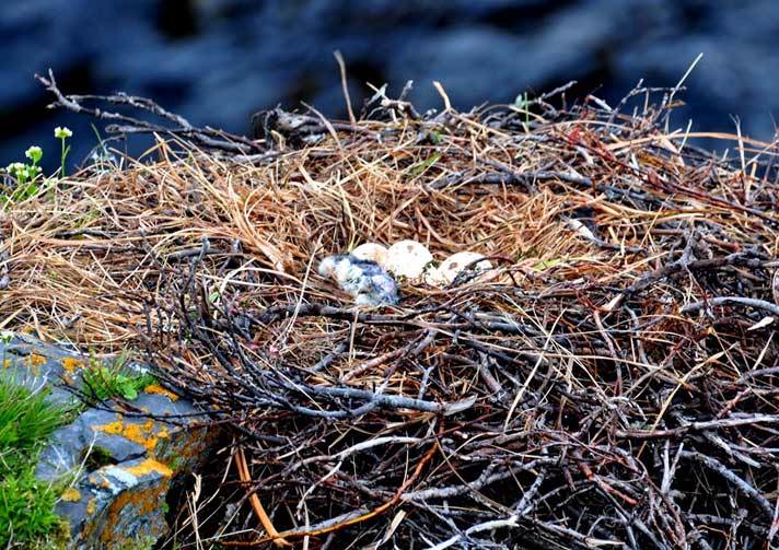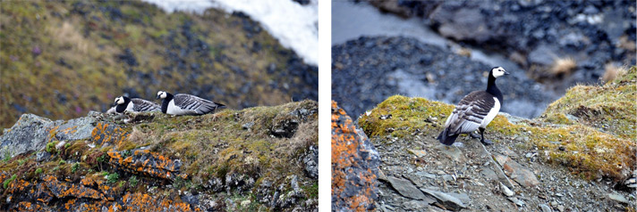 На скале, над водопадом, место под гнездо облюбовали белощёкие казарки. |
