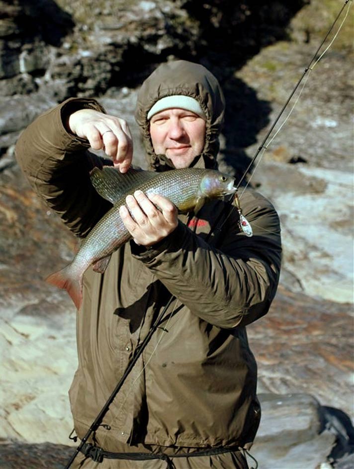 Выходит так, что мы преследуем скатывающегося хариуса. Значит, рыба должна уже достигнуть нижнего участка реки. Что бы ни терять времени, решаем пройти вниз по реке сразу до рыболовного домика. Пока переходили, погода улучшилась. Выглянуло солнце, ветер стих. Чем ниже мы спускались по реке, тем вода в реке становилась мутнее. Дело всё в том, что река в тундровой зоне наполнялась водой ручьев, которые протекали по торфяникам и глинам. Но ни чего критичного в этом не было. Просто нужно было ловить на яркие, хорошо видные в воде приманки. Что мы собственно и сделали. Я поставил вертушку AQUA COMET+BELL с яркими красными точками на чёрном фоне размером №3. По моим прикидкам её в мутноватой воде должно быть очень хорошо видно. Первые же забросы подтвердили мои предположения. Рыба ловилась на каждом забросе. Что бы ни травмировать хариуса и иметь возможность его отпустить, я на тройнике зажал два поддёва. И дело пошло. Небольшой пойманный хариус благополучно отпускался подрастать. |