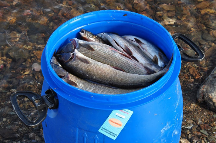 Хариусы почищены, бочка заполнена – пожалуй, этого хватит на ближайшие несколько дней. Хариус – очень вкусная рыба: его жарят, разными способами коптят, из него прекрасная уха, а только что выловленный из речки хариус очень вкусен и прямо сырым – с солью и чёрным хлебом. |