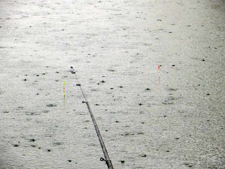 Дождик затих. Блин, зацеп, никогда в заливе не было. Вот же, клёв, мне снасть перевязывать. Ставлю, чтоб больше не мучиться с переоснасткой поплавка и грузов, на конце поводочек 0.12, карбон. Держит больше полутора килограммов.