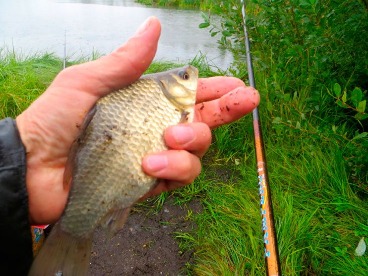 Ладно, на мне костюмчик нормальный надет, и то неловко, течет по рукавам, по спине ручейками, по штанам, сапогам и на траву. Сосед у меня крепкий орешек оказался, в плащ полиэтиленовый укутался по размеру явно на небольшого китайца и тягает карасей. Все же изловчился и я. Поплавок подпрыгнул и, так и не погружаясь полностью, поплыл в залив, явно против законов природы. Ветер-то воду наоборот из заливчика выдувает. Подсек аккуратно, чувствую, есть небольшой, и точно - в ладошку полностью уместился. Нормально, сегодня пруд на песках зарыблять. Беру, будет там жить. Поплавки красный, желтый карандашиками из воды торчат, от капель уворачиваются, вот же выбрал погодку для рыбалки.