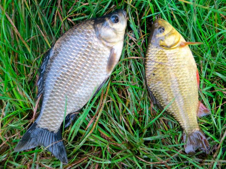 Разговорились о том, о сём, он при мне серебристого карасика выманил, и - о чудо! - золотого, чуток помельче, редкость для озера. Раньше думал, что они тут вывелись, как щука, однако есть, и никакого промежуточного вида золотистый с серебренный карасем не образуют. Каждый сам по себе. Запечатлел и обратно в воду отпустил, пусть растёт, размножается. Медленнее он почему-то вес и размер набирает. С чем связано - не пойму, может, золотой северный побратим южного серебристого карасика.