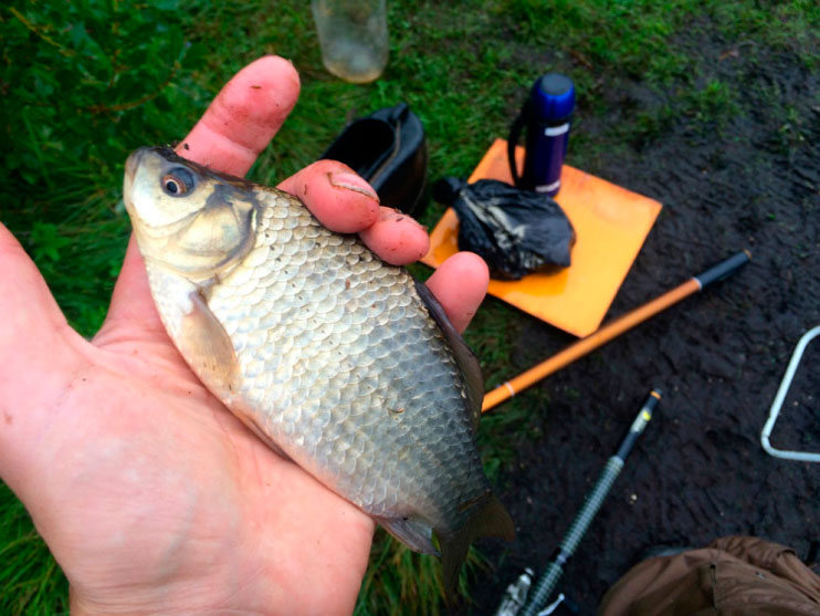 Меж делом мелкий гальян проскакивает. Да караси их явно отгоняют. Раньше засилье гальянов бывало, тут единственный. Хороши карасики в ведерке плавают, плещут.