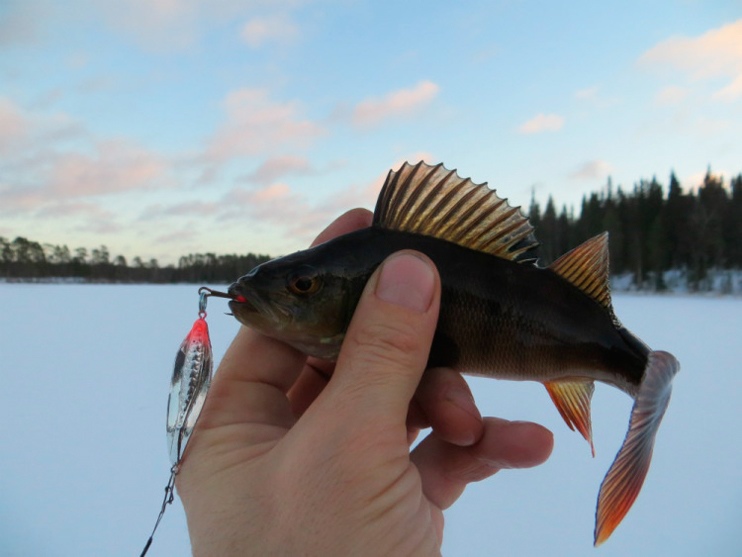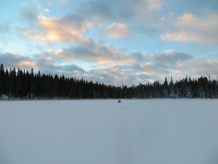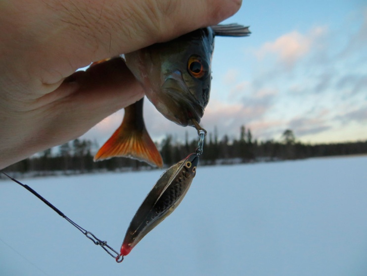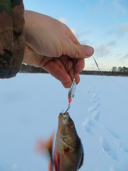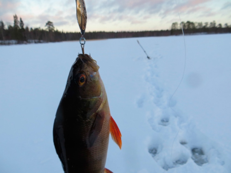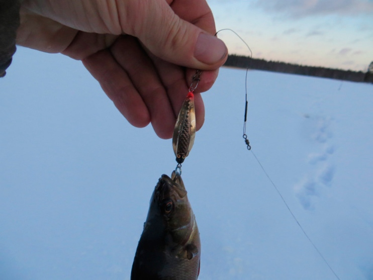 Сереет на глазах. Небо , хоть и отливает розовым, на озере явно потемнее становится. Подброс, ожидание, подброс. Минут пять мучаю лунку. Наконец, вознаграждаюсь квелым шевелением кивка. Пытаюсь подсечь. Мимо. Понимаю, что одного кончика червя нет. Играю, остановка. Шевеление. Подсечка. Мимо. Поднимаю блесну. Точ , червяк отсутствует. Так всегда, две слабеньких поклёвочки и можно наживляться. Упорствую, ловлю на голяк. Безрезультатно. Бегу на третью лунку. Оснащаю блёсенку червем. Минут десять ни могу дождаться ни единого шевеления. Поднимаю голову, точ сереет, так полностью и не расцвело.