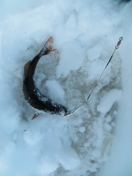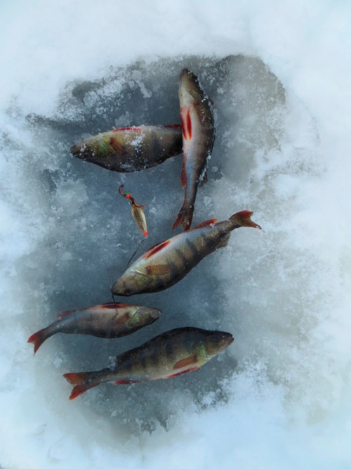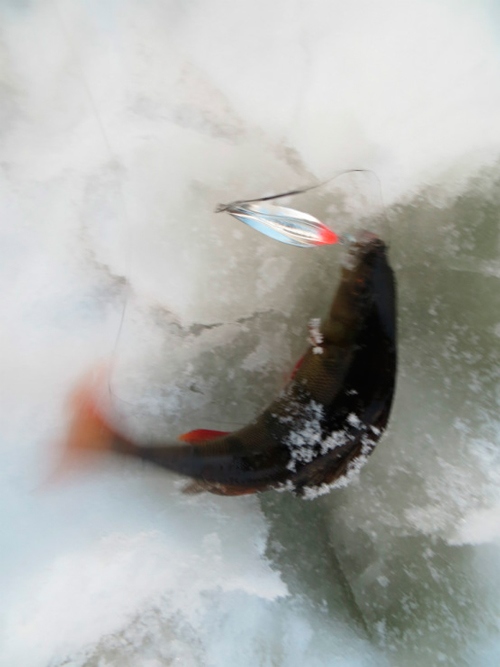нигде, ни следочка. И уж, ухаю, биссектрису из пяти лунок, как бы угол озера на двое рассек. Лёд сантиметров десяток иль с четверть, смотря с чью. Бурится легко. Можно , пожалуй, без остановки озеро разбурить, да время ловить не останется.