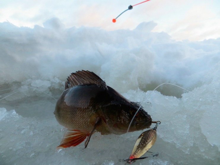 Подживлю червячка. До этого успел попробовать окуневый глаз. Сегодня на него ни одной поклевки, обычно он пользуется всеобщей популярностью. Знать, с клевом сегодня напряг. Выделываться не буду, и с проворством наживляю червя при сдёргивании. Червячок ароматно пахнет. На запах, точно окунишка пожалует, да при том с червем в лунку падет небольшое количество земли. Полагаю, она является приманкой. Опытный окунятник рассказывал, что он с вечера по известным местам сверлил лунки и прикармливал рубленным червем с землей. С утреца по тем лункам отлично ловил окуня. Не мелкого матросика, крупного, с рукавицу и более. Вот и пойми, почему крупный окунь прикармливается на мелкие кусочки червя и землю. Вероятно запах играет здесь первоочередную роль. И когда подкормленный окунь жаждет добычи, ему , кстати, приходится балансир иль блесна рыболова. Запускаю блесенку. Атака сразу. Подсечка. Есть.