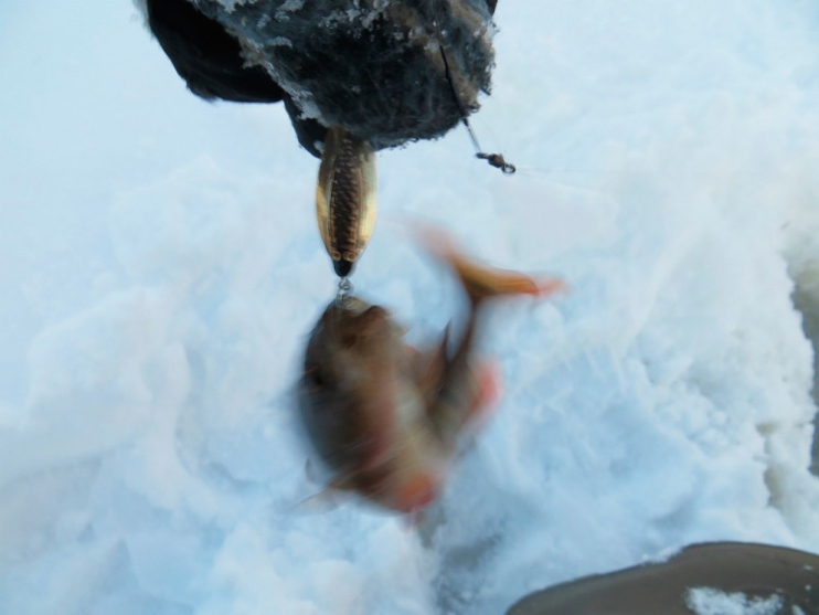 Перемещаюсь по лункам. При том пропускаю одну, сразу иду на третью. Пробую, тишина, затем на пятую, и вновь ничего. Надо ж. Возвращаюсь ближе к первой разловленной лунке.
