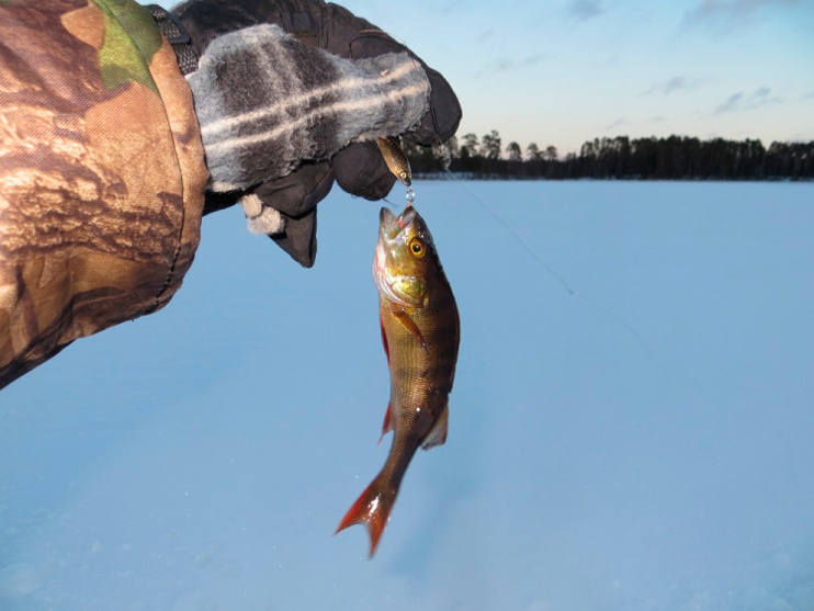 Что ж делаю серию лунок по глубине клева вдоль берега. Сразу иду на третью. На ней продолжаю ловить, считая с нарастанием. На одиннадцатой секунде удар. Не верится, не уж то окунь совсем разленился.