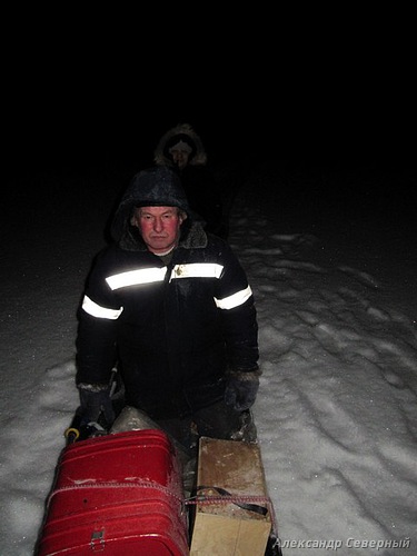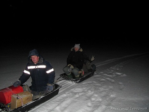 Прогноз на самое утро ещё радовал несильным ветерком и небольшим десятиградусным морозцем. К вечеру же дали шторм со снегом. Остановились в дачном поселке на берегу реки Сумки под единственным фонарем. На несколько тысяч дач и дачек один единственный. Так и задумаешься о богатстве России и её уснувших в зиму деревнях, раскинутых по дальним и ближним весям нашего Северного края. Букс затарахтел уверенно, чуть размял гусеницу, метров с полста, подвеску. На ходу запрыгнули ребята в санки, и мы поскакали по хорошей ухабистой дороге в сторону речки Малой Сумки. Тлеющий свет фары неясно освещал дорогу, надо будет покопаться в электрике, отметил, я, переложив это дело куда-то в дальнюю копилку. На выезде на лёд стоит иномарка, рыбаки в кромешной тьме у машины довольно покуривают, огоньками сигаретами проявляю свое наличие. Дорога то перед ними накатанная, знать куда-то приведет, и не нать лишние километры наматывать с ящиками и бурами на плечах.