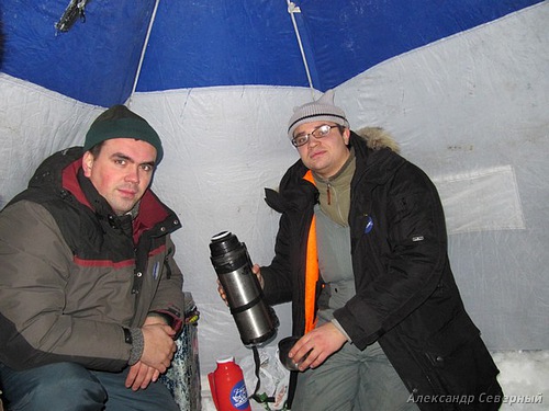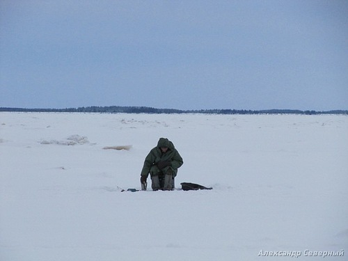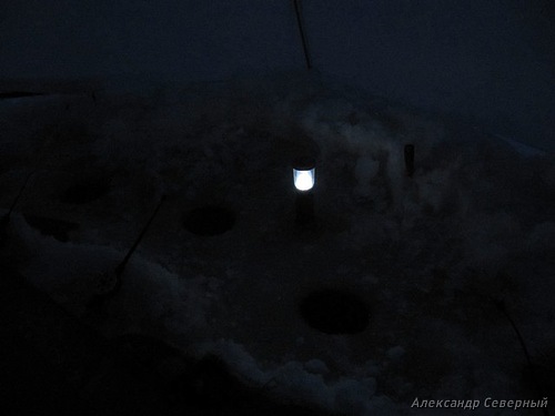 - Он Саня сидел с Федоровичем, поди, ты. Илья, чуть впереди, - в темноте угадываются ещё лунки.
