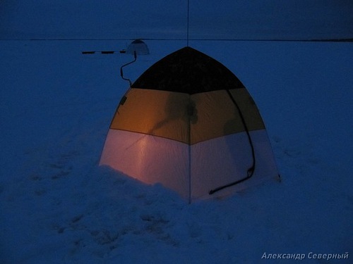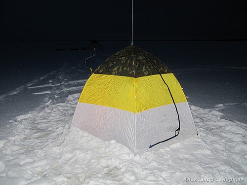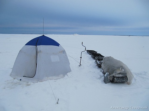 Оказалось, что мы сильно заблуждались в оценке глубины. На одном и том же расстоянии от косы разница в глубине у нас составила около метра. Всех больше повезло мне. Желая сесть помельче, я влетел наглубже. Под два с половиной метра! Вот, эдак мель. Оставалось уповать на отлив. Да на то, что, не проверив дна, сразу забурил четыре лунки, поставил палатку, растянул её растяжками, обустроился в своем курятнике, як дома. Уютно, душевно. Куда теперь выходить, да, ну, его!