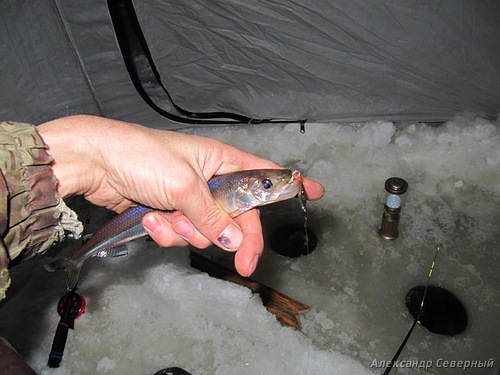 Заглядываю, да у него уже четыре корюшка трепещутся, отливают синевой. Зубастики!