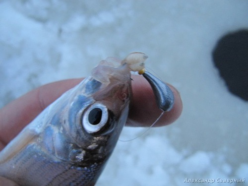 Плавный подъём руки вверх, леска выбирает слабину, приятно пружинит и ходом за блёсенкой вытягивает остренького, как торпеда, корюшка. Чуть больше карандаша.
