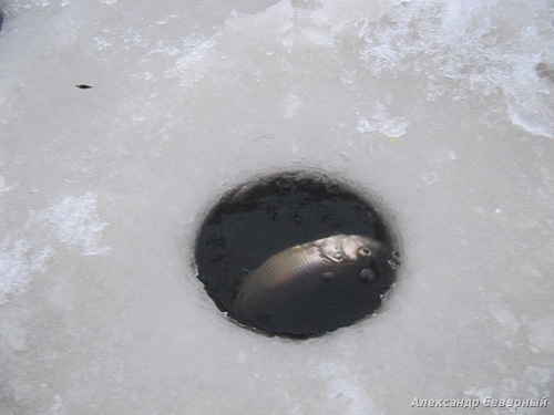 Подсечка. Плавно тяну кверху, увеличивая постепенно скорость подъёма. В темной лунке мелькнуло тельце, полетели брызги в стороны. Еся!