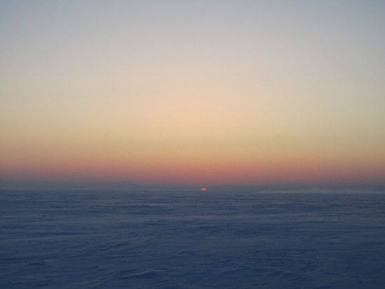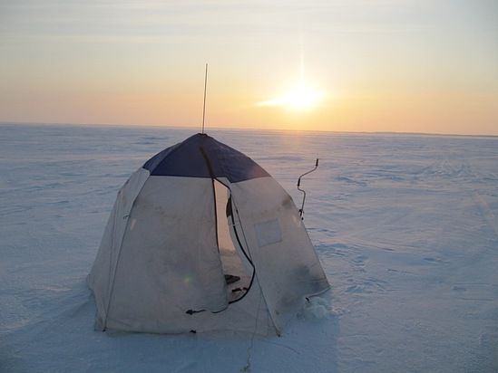 Колеи разбегаются и сходятся, выбираем ориентир небольшое межгорье на острове и рулим километра три прямо на него. Ближе, ближе, начинаем закладывать круг, всматриваться в знакомые зацепки, остатки устоявших на упругом ветру ропачков, ищем заветную веточку, воткнутую с прошлом разе. "Дак вон она, тормози!"
