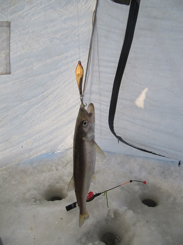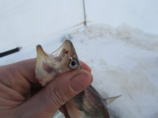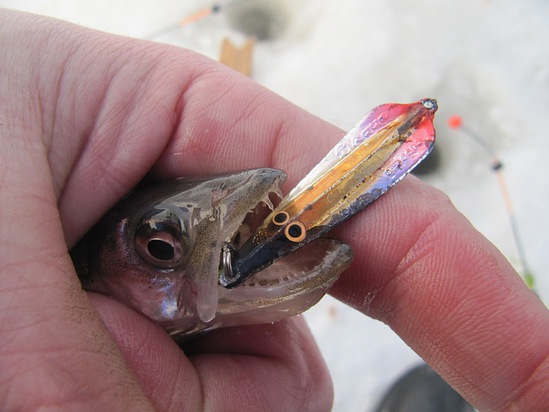 Фото. Корюшка заглатывает троиник блесны зимней AQUA БЛИК целиком