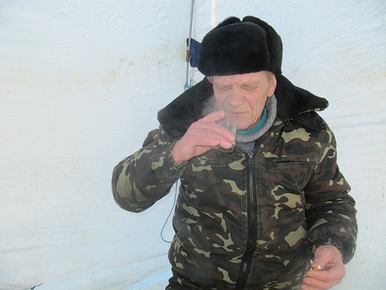 Наполнен стакан русской водочкой. Ну, как тут в мороз да с запотевшим стеклянным краешком, обязательно вторую за рыбалку.