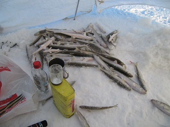 Да, оно, конечно. Улыбаюсь сейчас. Пала вода, подо льдом оставив чуть больше четверти. Время сиговое наступило. Корюшка затихла, отойдя поглубже. Лишь редко, редко пошевелит кивок. Да и размер помельчал.