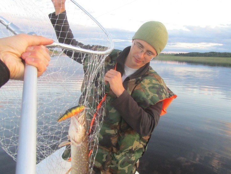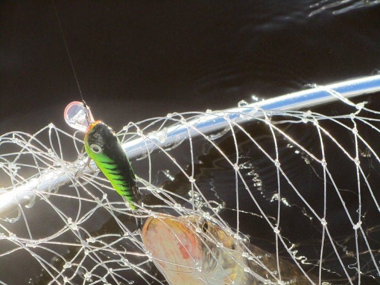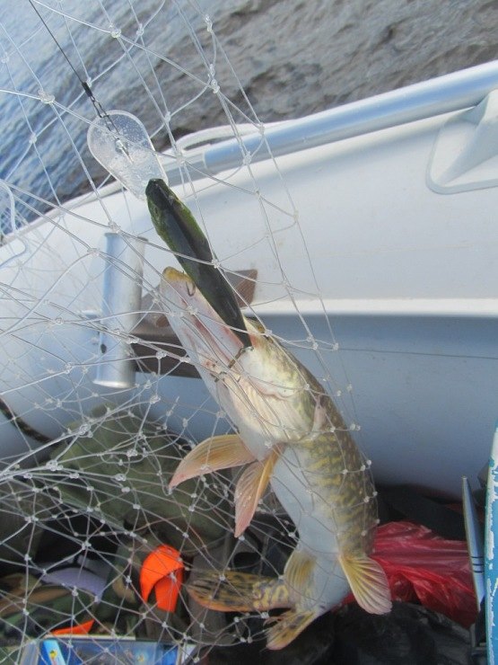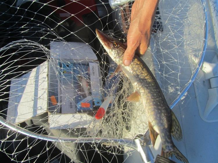 И верно, кончик спина прижимается, напарник делает подсечку, выводит небольшую щучку к борту. До чего привлекательная тигровая окуневая раскраска в светлый день.