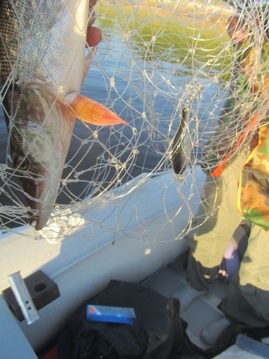 Выходим к судоходному руслу, мы над глубиной, воблеры преодолевают скат. Потяжка. Некрупная. Веду. Все равно рад. Когда долго не клюет, радуешься любой рыбке.