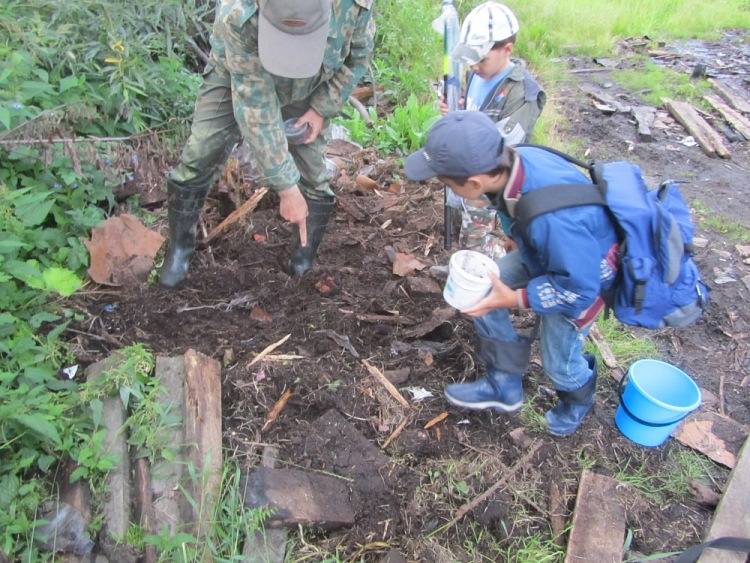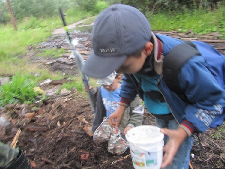 Вначале копка червей. Леонид показывает Сёме и Егору каких брать, каких оставлять.