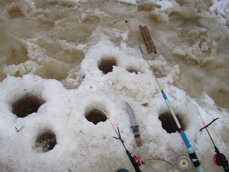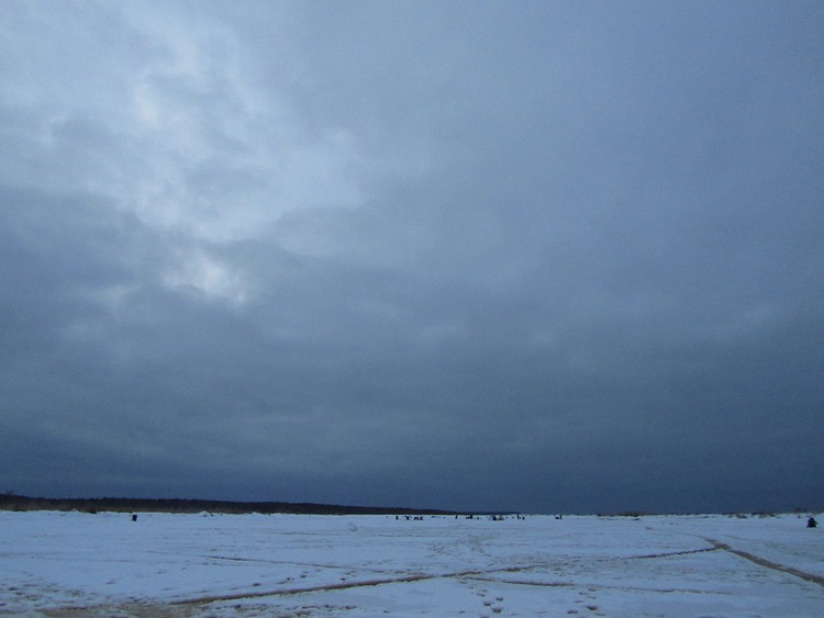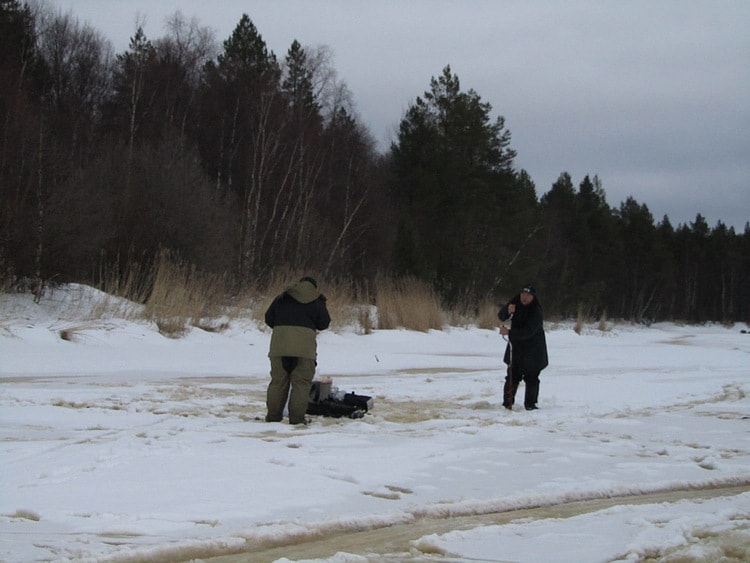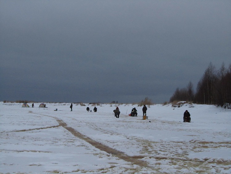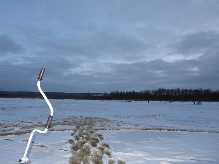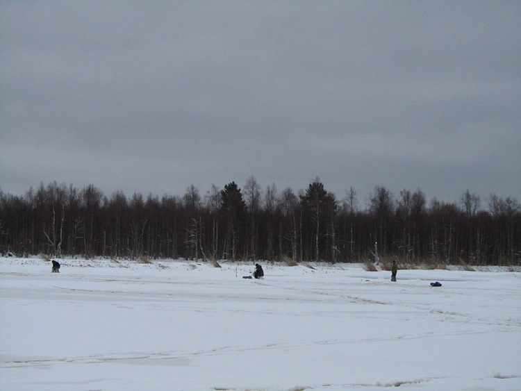Идем по речке с километр вверх по течению, лунки попадаются, народу немного. У островка промеряем речку поперек. Под левым берегом воды нет, ушла в море, к островку с полметра, потом коса. Под правым обнаруживаем ямку с метра полтора глубиной. Занимаем оборону.
