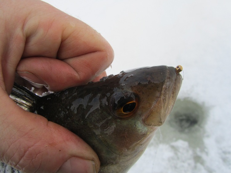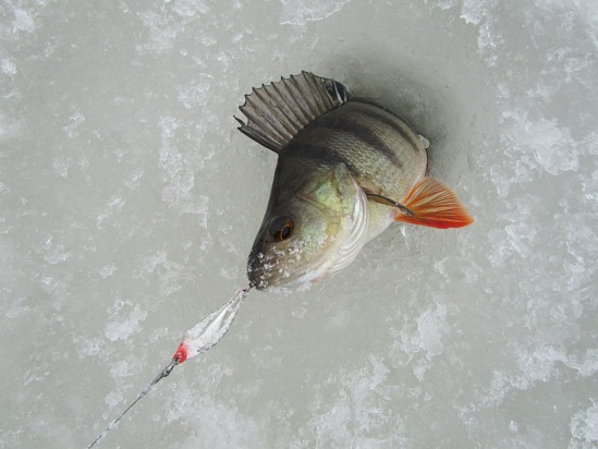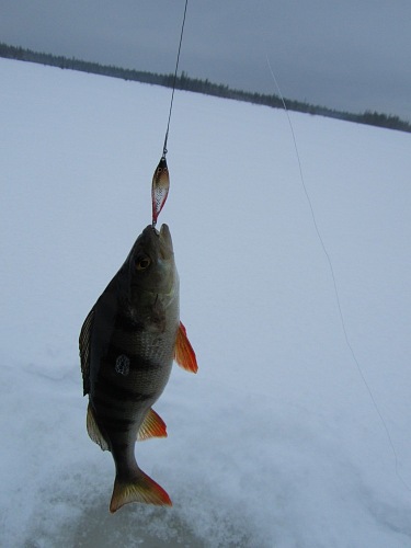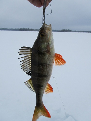 Прижало посильнее. Да и сам порезче подсечку выдал. Поднимается лениво, правда, разгону нету, как у мелкого окушка. В лунку повёл, ах, красивящий растапыра вываливается на лед.