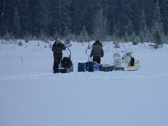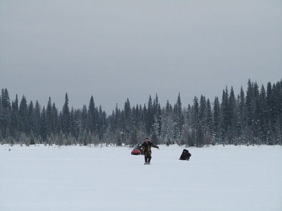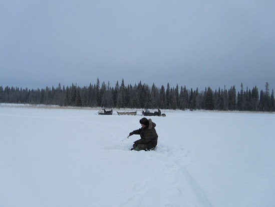 Саня вокруг по лункам нарезает. Рыб отсутствует.