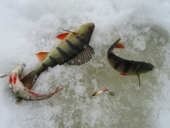 Парочка. Дальше двигаюсь. Через одну дырку поклёвка. Один стоял. Теперь новая биссектриса. Иду на «Вы». Просто так ткнул пальцем и шесть лунок через 20-25 метров одну от другой заложил. Будет рыба. Только подумал. Блесну подкинул, сыграл пару тактов. Прижало. Леска достойно отыгрывает. Вода в лунке пошевеливается. Есть окунек на озере. Видать на стайку попал. Штучек пяток один за другим. В снегу прыгают, крутятся. С трудом блесенку к ним пристроил, чтоб натюрморт сфоткать