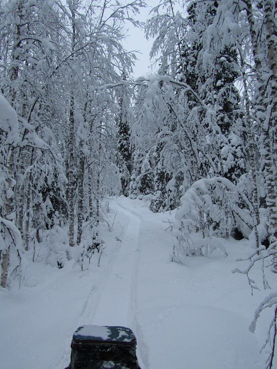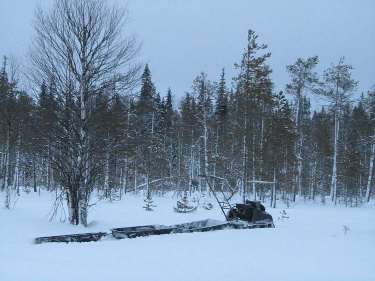 Проехал метров сто, да оставил букс у берега, начал путик бурить. Дальше не рискнул забираться, мужики, что у Николая с Михаилом в избе жили, сказали, вода под снег пошла. Слузу много. В слуз попадешь, намаешься выбираться, да потом выбивать намерзший снег с подвески. Пусть тут стоит.