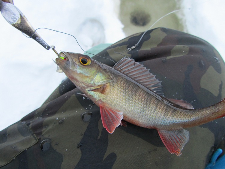 Фото. Окунь зацеплен двумя крючками тройника. Атака блесны AQUA «Русалка» даже в глухозимье рыбой азартна.