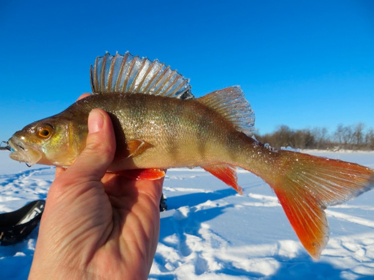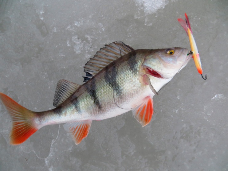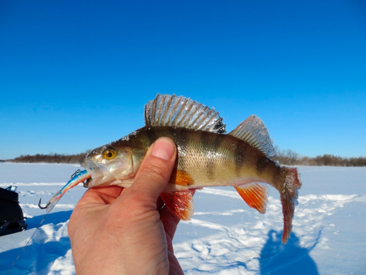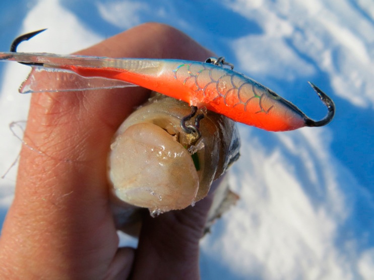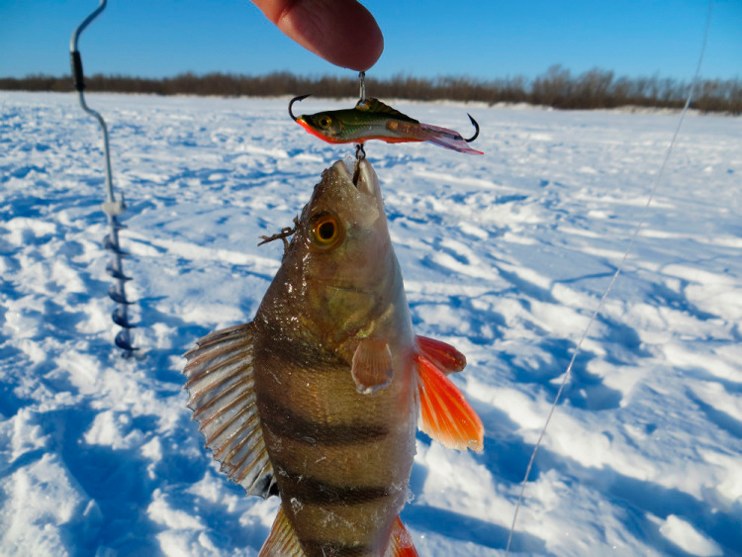 Постепенно балансир спускаю до дна. Несколько «па» над поверхностью. И начинаю подъем, будто безмотылкой играю. Мелкая тряска без остановок и неспешным подъёмом. Достигаю кромки льда. Резкое опускание приманки вниз, планирование до дна. Легкий подброс на четверть и замирание. Тычок. Окунь явно со стороны пожаловал. Увидел движение балансира издалека и подкрался…». «…Ага, и у Георгия окунёчек провернулся