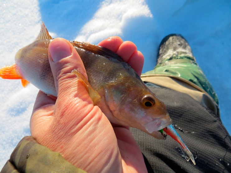 Попадается раненый окунишка.