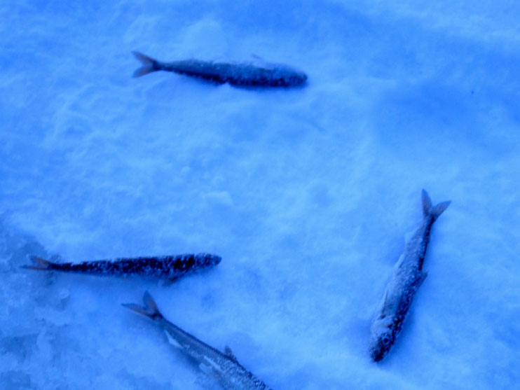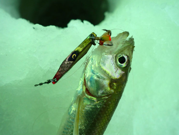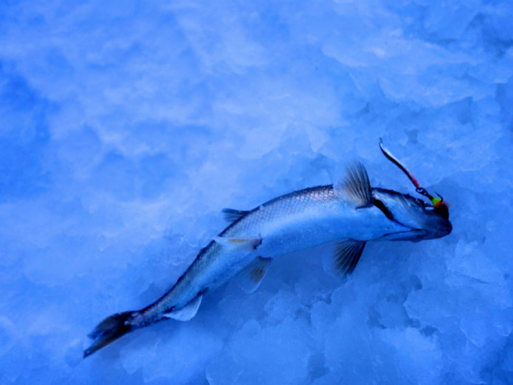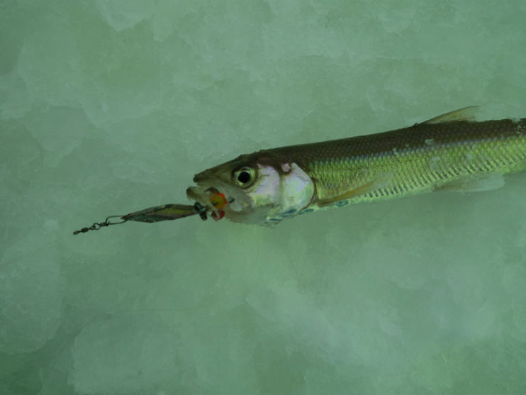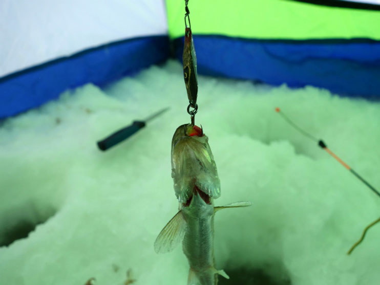 Как уже отмечал хороших хваток нет, ленивое шевеление, и если сразу дергаешь, то большее вероятность остаться без наживки, так как рыбка прихватила другой конец и держит его в острых зубах, либо просто сделать пустую подсечку. Иногда при поклёвке под льдом удается выхватить корюшонка висящего просто на наживке. Чуть приоткроет пасть и падает вниз. Сразу блесну с корюшком в сторону от лунки, то потом черпай его в ледяной воде.
