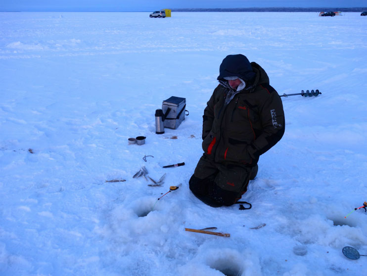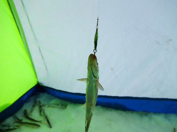 Он так увлекается, что даже с коленей не встаёт. У меня средний корюшок, при том уже не по два сразу, сразу по три и четыре в ряд. Вытаскиваю, начиная сверху из-подо льда. Потом начинаю постепенно мягко покачивая кивок, опускать блесенку к низу, и на разных глубинах потычки. Последняя, как правило у дна. Сниму урожай. И снова отогреваться в палатку.