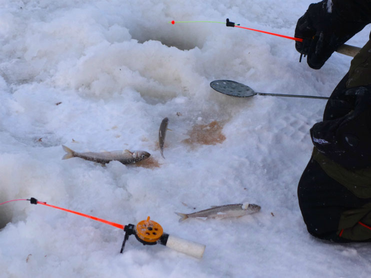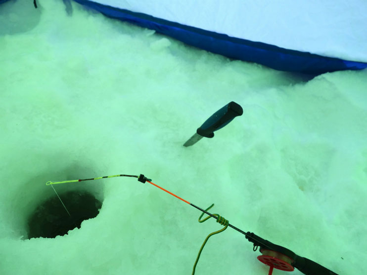 Сам начинаю метаться на два фронта. Сбегаю в палатку, пару штучек вытащу, отогреюсь. Клёв затихает. Бегу к товарищу, тут клюёт.